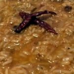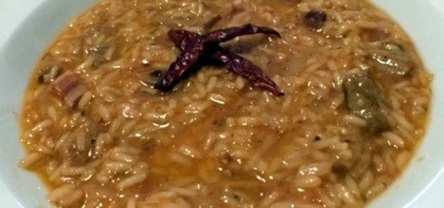 - Dodati rižu i pojačati vatru da se prži, uz stalno miješanje. Poslije 1 minuta dodati bijelo vino i nastaviti mješati. Poslije par minuta dodati kutlaču vrele juhe. Nastaviti dodavati juhu svaki put kad tečnost ispari iz riže, konstantno miješajući.