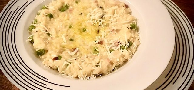 Kremasti rižoto sa graškom, kozijim sirom i hrskavom slaninom
