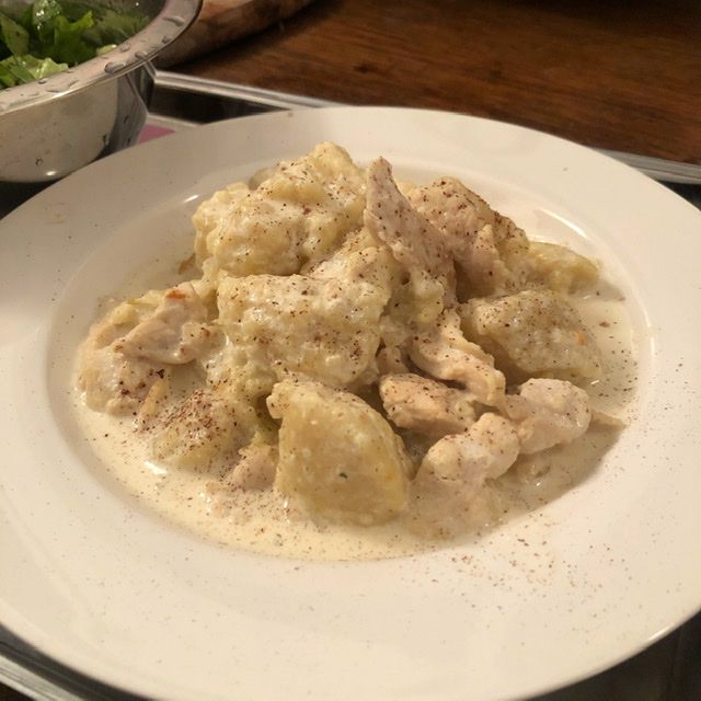 Na zagrijanoj masnoći izpržimo piletinu i dodamo povrće. Kad povrće omekša, dodamo sitno narezanu pancetu, začinimo po ukusu te zalijemo bijelim vinom. Kad vino ispari, dodamo pasiranu rajčicu i noklice.