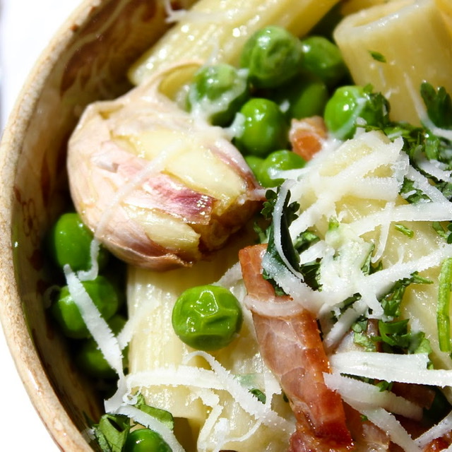 Kad se isprži, staviti sa strane. U zavrelu, posoljenu vodu staviti grašak i tjesteninu. Kuhati tjesteninu prema upitama sa pakovanja. Kad je gotova tjestenina, gotov je i grašak. Prebaciti u tavu gdje se ispržila panceta, pa sve zajedno na laganoj vatri izmješati. Po potrebi dodati malo maslinovog ulja. Na kraju naribati sir i posuti sitno narezanim peršinom i sve zajedno promješati.